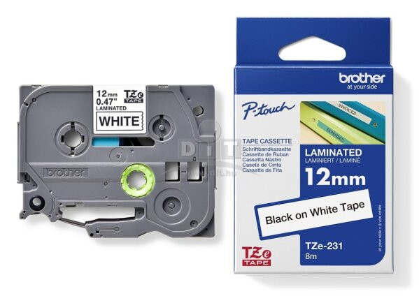 12 mm széles, 8 m hosszú, fehér alapon fekete betűs, öntapadós címkeszalag laminált tartós feliratok nyomtatásához.