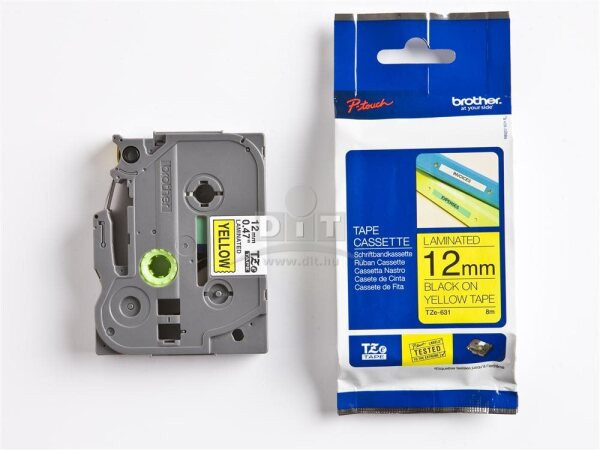 12 mm széles, 8 m hosszú, sárga alapon fekete betűs, öntapadós címkeszalag laminált tartós feliratok nyomtatásához.